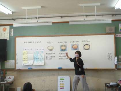 2年生の「食に関する学習」で,「おこめはかせになろう」の学習をしました。給食に出てくるご飯の種類や,ご飯粒が食器につかないように食べる方法などを学びました。子どもたちは,お米をさわったり,においをかいだりして,「お米にもにおいがあるんだね!」と驚いていました。早速,給食のご飯を,食器につかないように食べました。お家でも,残さずきれいに食べてほしいです。