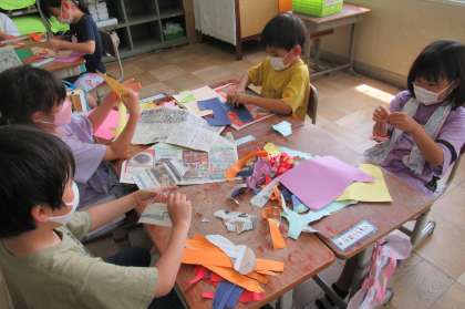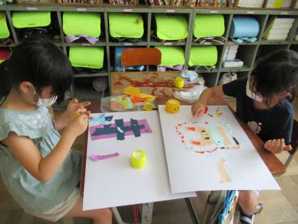 紙を破いたりちぎったりしたときの感触、工作のりを手で塗ったときの感触、形や色の組み合わせなど、様々な感覚を働かせながら、楽しんで取り組みました。