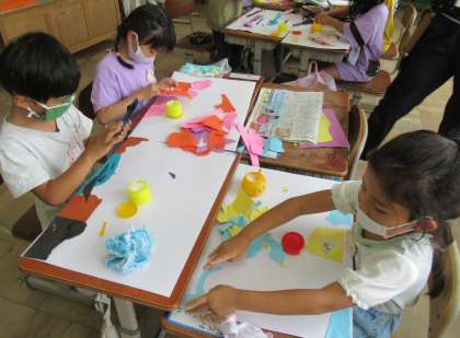図画工作科の学習です。画用紙や新聞紙などを手で破き、破いた形をよく見て好きなものを表現しました。一枚の紙から「包丁に見える!」「クジラに見える!」「縦にすると木になる!」などと発想を広げ、思い思いの作品を作りました。