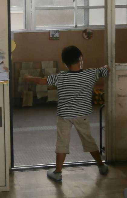 算数科「大きさ比べ」の学習で,いろいろな長さ比べをしています。今日は,動かせないものの長さを比べる活動をしました。教室の入り口から机を出すことができるかどうか,紙テープを使って調べました。