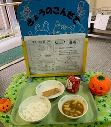 10月の給食指導目標は、「なんでも食べてじょうぶな体を作ろう」です。食欲の秋、実り秋です。今月も旬の食材を使った献立や子どもたちに好評な献立がたくさん出てきます!