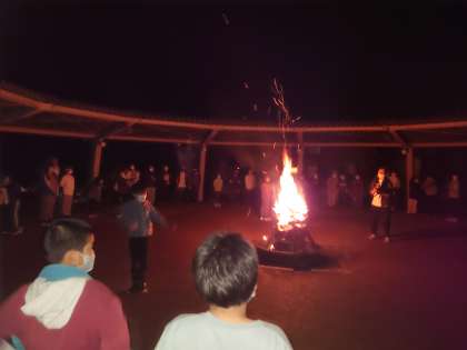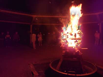 徳政さん(火の神)が火をもたらし、みんなの「燃えろよ燃えろ」の歌声で火はさらに燃え上がっています。