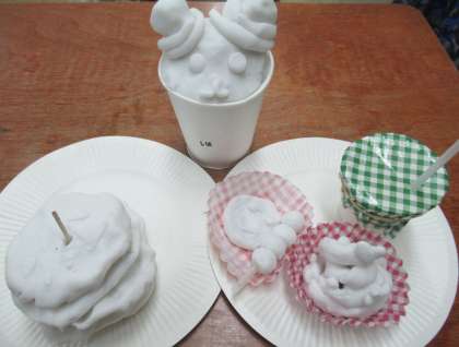 お弁当やケーキ、ハンバーガー、パフェなど、粘土で思い思いの食べ物や飲み物を作って交流をしました。