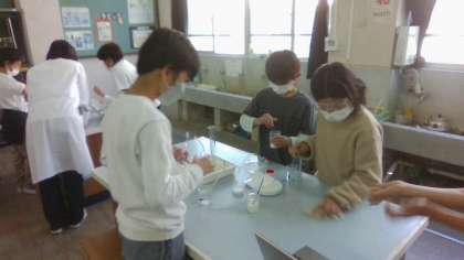 食塩やミョウバンの溶ける量を増やすには、どのようすればよいか考え、意見を出し合いました。