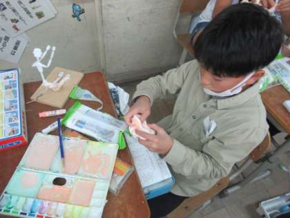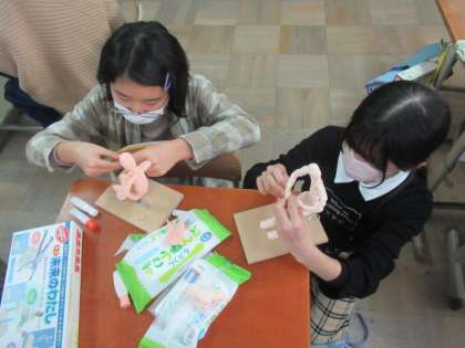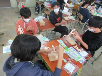 前回、ポーズを決めた骨組みに粘土を付けています。