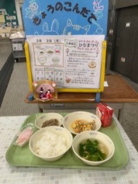 今日の献立は、「ごはん、牛乳、平天の煮つけ、黒豆、みそ汁」でした。正月料理の一つ黒豆の「まめ」という言葉には、「真面目」や「健康」という意味があります。「今年一年まめ(真面目)に働き、まめ(健康)に暮らせますように」という願いをこめて、正月に食べます。