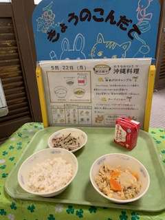 今日の献立は、「麦ごはん、牛乳、油あげのチャンプル、クーブイリチー」、沖縄の食文化を伝える献立でした。