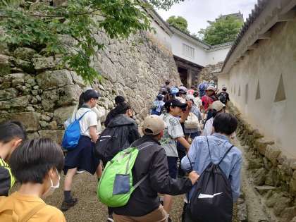 姫路城を探索しています。急な坂や階段を頑張って上っています。