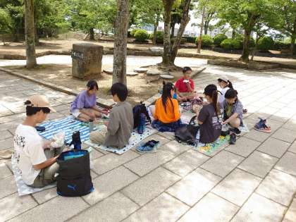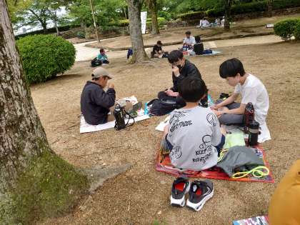 お弁当の時間です。お城探索でお腹ぺこぺこ。みんなおいしそうに食べています。