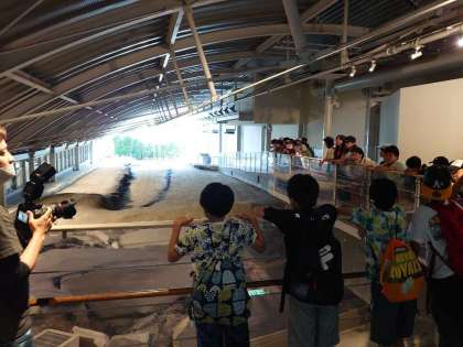 館長さんのお話を聞き、本物の野島断層を見て、阪神淡路大震災について学んでいます。