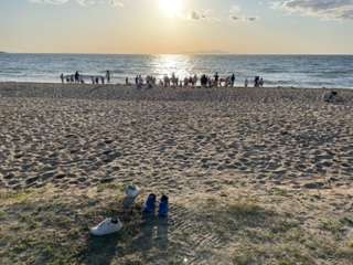 宿舎のまえの砂浜でしばらく波と砂で大はしゃぎです。