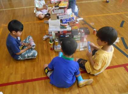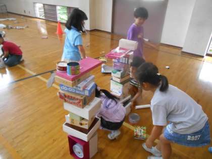 自分の背よりも高く積むグループ、トンネルを作るグループ、たくさんの箱を敷き詰めてみるチームなどがあり、さまざまに工夫をして楽しみました。