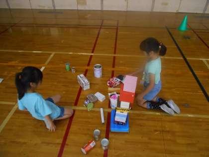 体育館で箱を自由に並べたり積んだりしました。