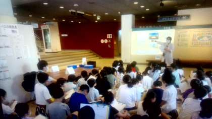 はじめに、施設の説明をしていただきました。楽しそうな展示がたくさんありそうで、わくわくした様子の子どもたちでした。