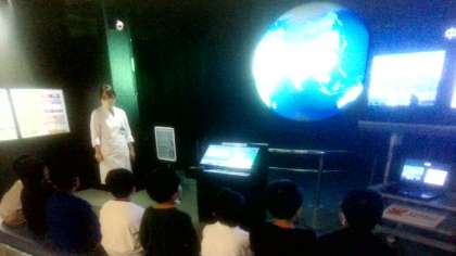 私たちの身長よりも大きな巨大地球儀、「みらい地球儀」を見ながら、過去・現在・未来の地球について考えました。