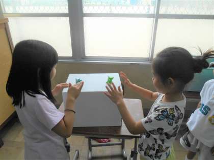 写真は、折り紙で作った紙相撲をしているところです。