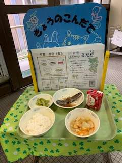 今日の献立は、「胚芽米ごはん、牛乳、さんまのしょうが煮、えだ豆、キャベツのすまし汁」でした。