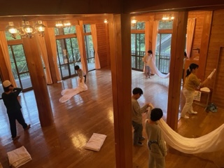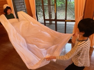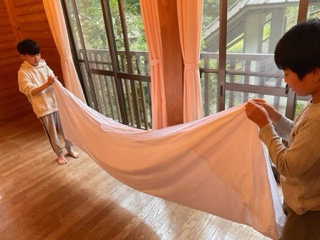 6時。チャイムとともに子どもたちの眠そうな声が聞こえます。ただ、ゆっくりはしていられません。朝一番の大仕事、それは「シーツたたみ」です。角を揃えるのが難しいですが、協力してシーツをたたんでいます。