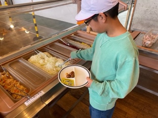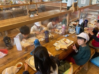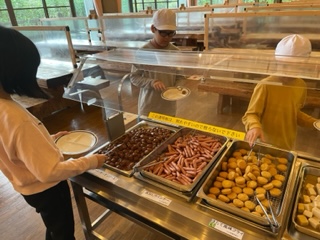 3日目の朝食。今日の活動の源となる朝食。いっぱい食べて、笑顔でピース!