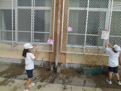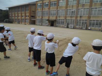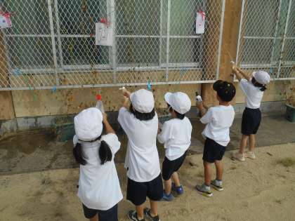 容器を使って、水を遠くに飛ばしたり的を狙って飛ばしたり絵を描いたりし、楽しみました。