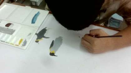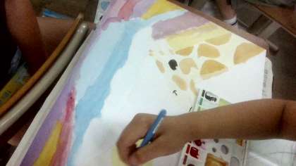 お話を聞いてイメージしたものを描いた作品に、先週に引き続き丁寧に色を付けています。絵の具や水の量を調整しながら、想像に合う色をこだわって作っている姿が素敵です。
