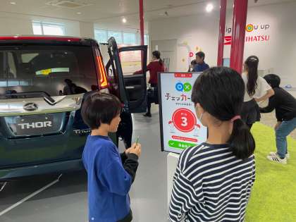 展示ブースでは、検査体験をさせてもらいました。タブレットの指示案内を見て、自動車が正常に組み立てられているのかを調べました。