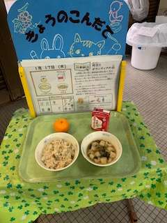 今日の献立は、「鶏ごぼうごはん、牛乳、みそ汁、みかん」でした。