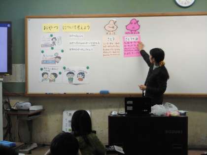 3年生では、食の指導で「おやつについて考えよう」について学習をしました。自分が食べているおやつを6種類を分けて、どのようなおやつがよいのか考えました。油分や、塩分や、砂糖が多いものではないものがよいことがわかりました。体にとって、よいものを取り入れることを心がけていきたいです。