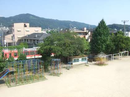 8月17日(月)に,大文字山をバックにしたサクラ(ソメイヨシノ)の写真を中校舎3階より撮影しました。本校の横を走る叡山電鉄きらら号とともに撮影しました。定点観測として写真を掲載します。(写真右上・画像2)