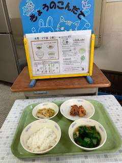 今日の献立は、「ごはん、鶏肉の塩こうじあげ、キャベツのごま煮、みつばのみそ汁」でした。今月の和食推進の日、「和(なごみ)献立」でした。