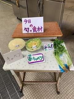 「キャベツのごま煮」は、春においしい旬のキャベツを使用しています。「春キャベツ」の柔らかさやあま味とごまの香ばしい香りが、楽しめる献立です。