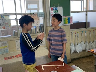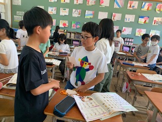 Unit1の学習で覚えた、自己紹介のフレーズを使って、クラスの友だちと自分の名前の綴りやすきなもの・ことを伝え合う活動をしました。手作り名刺も交換しながら行いました。