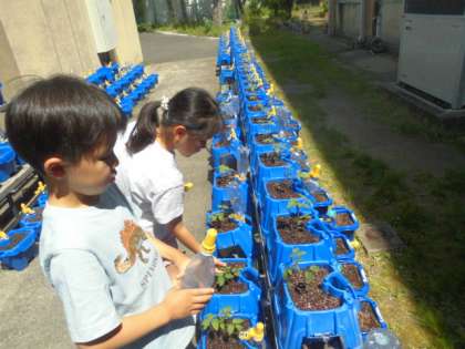 2年生の生活科の学習「ぐんぐんそだて おいしいやさい」では、ミニトマトを育てています。朝登校したら、「ミニトマトの〇〇〇ちゃんを見に行ってくるよ!」「お水やりに行ってきます!」などと嬉しそうに様子を見に行っていました。これから大切に育てていきます。