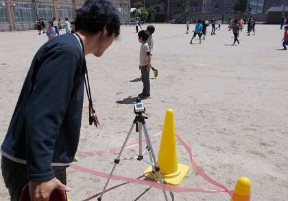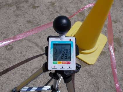 学校では、熱中症指数を測る機器を運動場に設置し、子どもの背の高さに合わせて日なたで熱中症指数を測っています。