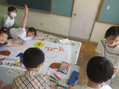 活動係は、山の家での3日間掲げる養徳オリジナル旗づくり