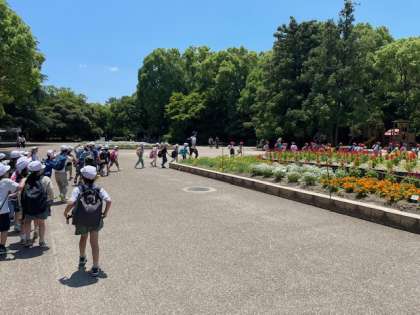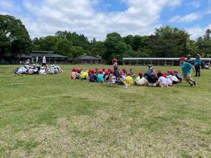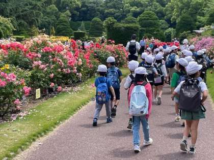 様々な色のバラが咲き誇るバラ園から園内を巡り、芝生広場でレクリエーション。