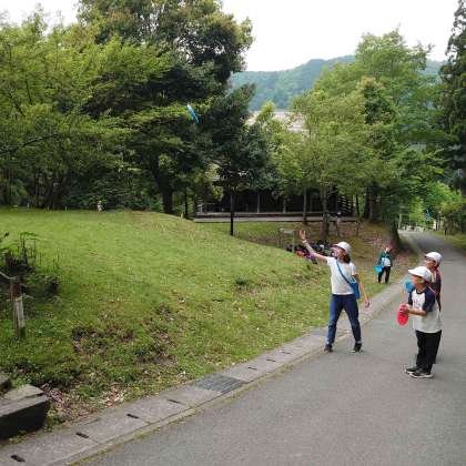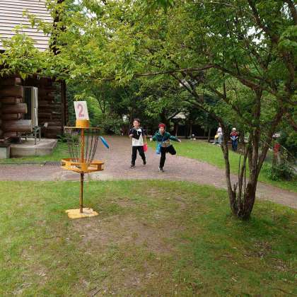 アスレチックの後はフライングディスクゴルフです。みんなでスコアを競いながら山の家の広い敷地を巡ります。