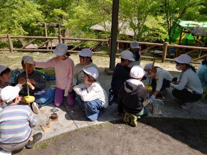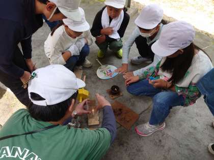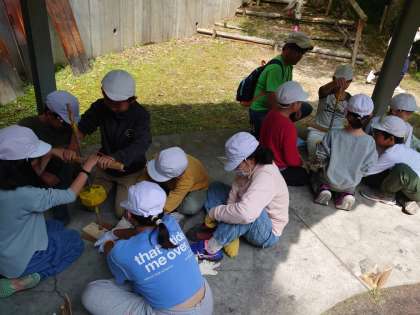 野外炊事に向けて火起こしをしています。班で協力して火起こしの棒を回します。火がつくと「やったあ!」の声が響きます。