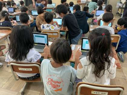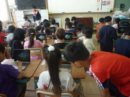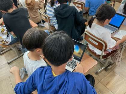 初めてタブレットを使いました。電源の入れ方から6年生にやさしく丁寧に教えてもらいながら挑戦!