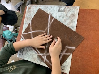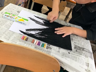 コンテを画用紙いっぱいに濃く塗りつけて、それを消しゴムで消していくと、少しずつ浮かんでくる線や形。消してできる形や線のおもしろさや美しさを味わいながら、いつもと違った方法で絵を描きました。手がこんなすごいことになるぐらい、がんばりました!