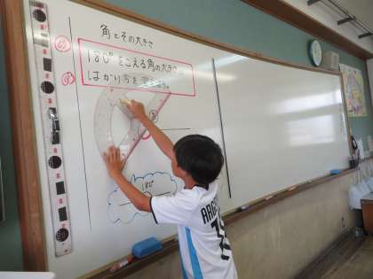 算数科では角の大きさについて学習しています。180度を超える角の大きさについて、どのようにして大きさを求めるか話し合っている様子です。これまでの学習を活かして、様々な意見を出し合っていました。
