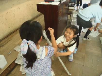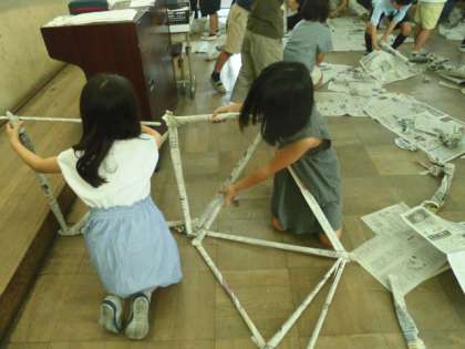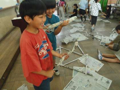 2年生の図画工作科「しんぶんしとなかよし」では、新聞紙を使って、思いついたことからためして、家や服やぼうしなど、いろいろなものを作りました。テントみたいになって、とても喜んでいる人もいました。