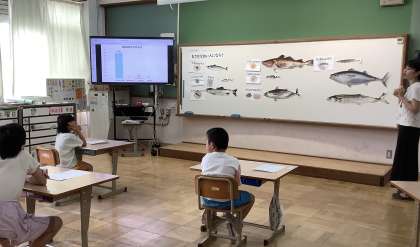 「お魚名人になろう」の学習をしました。魚の名前のクイズを考えたり、魚の写真とマッチングして魚つりゲームを楽しんだりしました。最後に、魚の上手な食べ方にチャレンジしてお魚名人に近づきました。