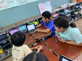 5年生は、学習した文型や単語を使って「Who is this?」クイズをしました。1組は2組の友だちに、2組は1組の友だちにクイズを出しました。「This is my best friend. He is funny and kind. He can play baseball very well. Who is this?」というように、タブレットに書いた英語を見せながらクイズを出し合いました。1組2組の合同外国語の授業は初めてで、子どもたちはとても楽しそうに、クイズ大会を楽しんでいました。