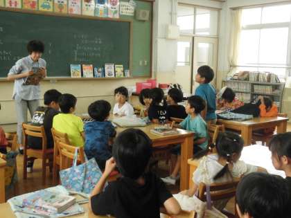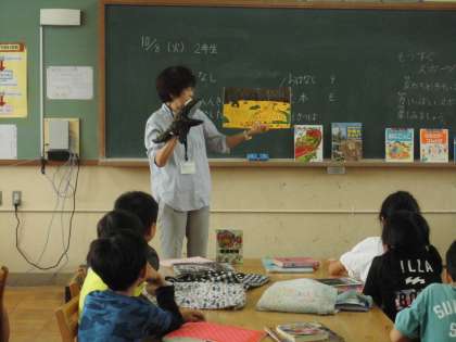 2年生の図書の時間に、図書館の本をどのように大切にしたらよいのかについて、みんなで話をしました,その後、「おれはティラノサウルスだ」を読んでもらいました。ティラノサウルスの人形も出てきて、大喜びで聞いていました。その他にも、ティラノサウルスの本があったので、興味をもって借りている人もいました。
