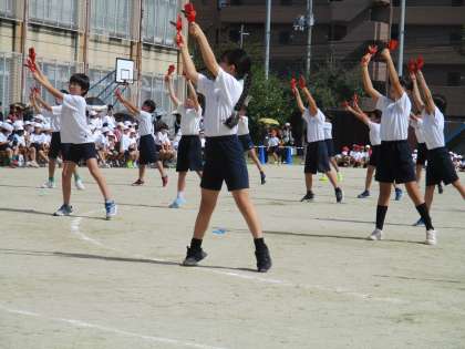 4年生の団体演技では、練習してきた成果がでて、一人一人がとてもよい表情ですることができました。