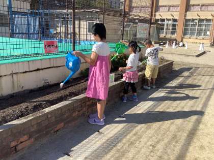 8日(火)に、冬野菜の種まきをしました。今日、大根・二十日大根・小松菜のイラストを描いた立礼を立てた後に、水やりを行いました。観察をしている時に、発芽を発見!みんなで冬野菜の成長を楽しみにしています。