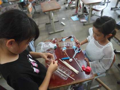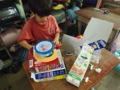 2年生の生活科「あそんで ためして くふうして」の学習で、動くおもちゃを作っています。今日は、動くしくみを考えて作りました。動く車や、めいろ、ゴムを使った動く動物など、いろいろなものを考えています。これから工夫をしながら、作っていくことが楽しみです。