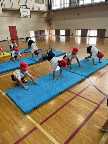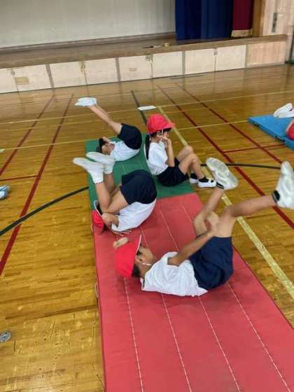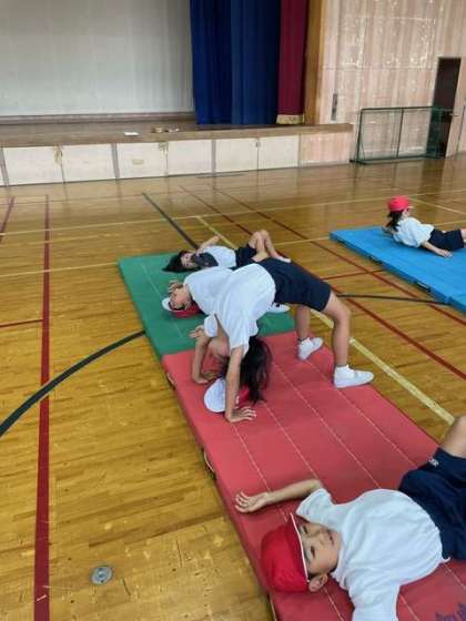 体育科の学習で「マット遊び」が始まりました。今日はマットの運び方や並べ方,体なら詩ををしました。
