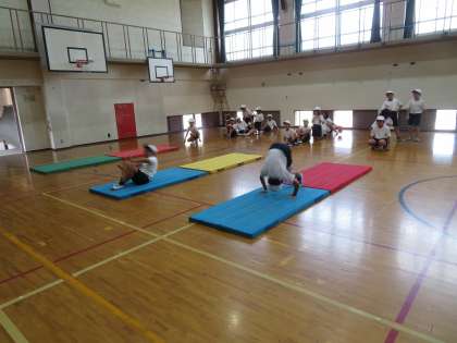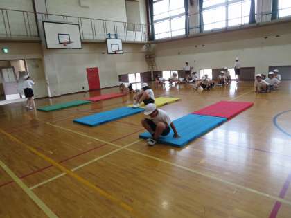 体育科「マット運動」の学習の様子です。1年ぶりのマット運動。3年生で学んだ技を思い出しながら新しい技に挑戦しています。「開脚前転ができるようになった!」「後転ができるようになった!」と練習の成果を発揮した嬉しい声もあがっています。